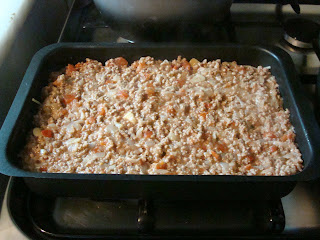 Escorra a água do esparguete e num tabuleiro, de ir ao forno, coloque metade e cubra com a carne