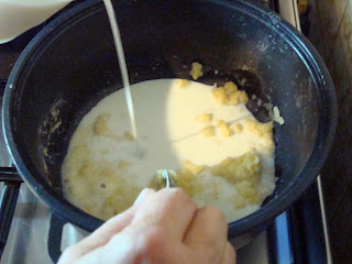 Entretanto faça molho bechamel: num tacho coloque 2 colheres, de sopa, de manteiga ou margarina e ponha em lume, brando, a derreter. Depois junte as 2 colheres de sopa de farinha e misture com a margarina.
