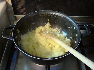 Num tacho deite o azeite, a cebola e o alho e deixe fritar até a cebola ficar transparente
