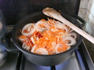 Junte a cebola, os alhos, a cenoura, o pimento, as folhas de loureiro, o vinho e a água. Tempere com sal e deixe cozer em lume brando cerca de 1 hora, com o tacho tapado. Agite o tacho de vez enquanto.