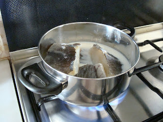 coloque o bacalhau, descongelado, num tacho e cubra com o leite. Leve ao lume e logo que o leite levante fervura apague o fogo e tape o tacho.