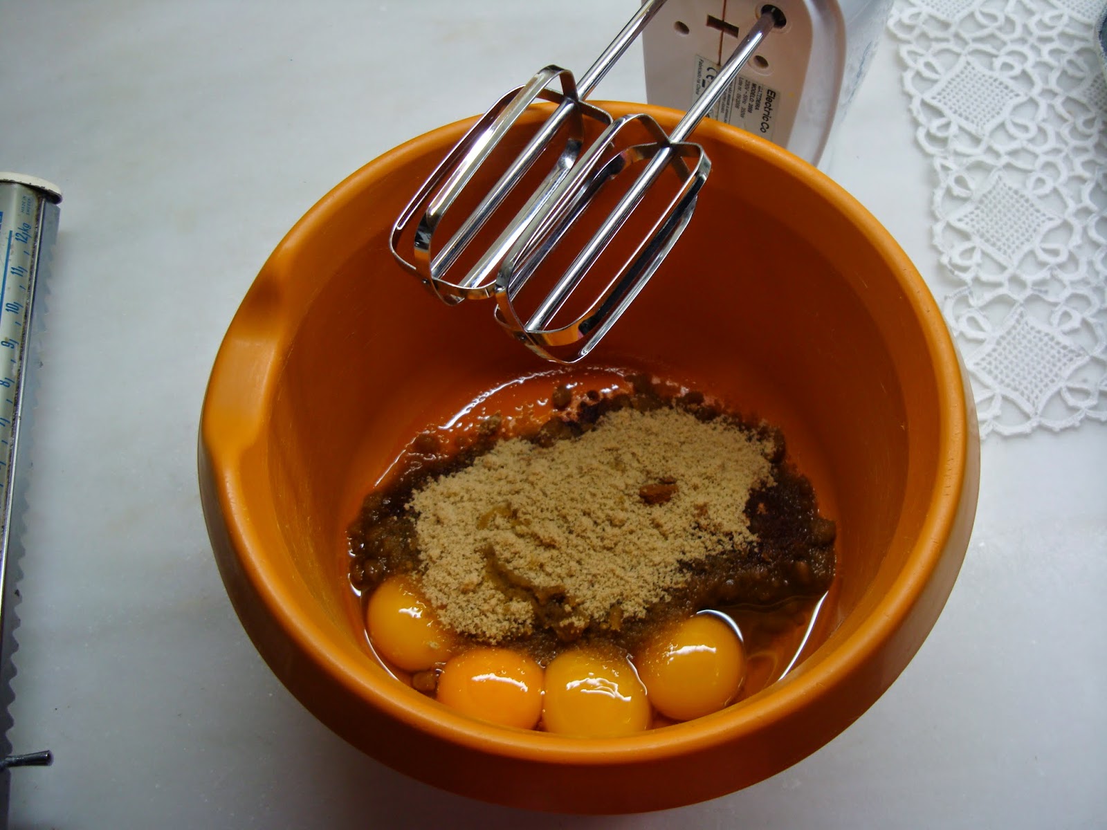 Com a ajuda da batedeira, bata as gemas com o açúcar, a canela e o azeite até obter uma mistura homogénea (cerca de 5 minutos). Junte o vinho do Porto e envolva bem