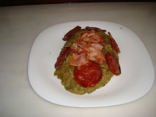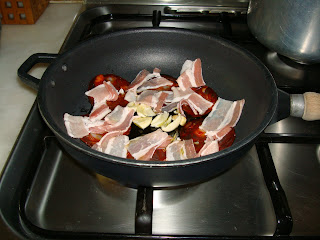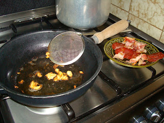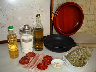 Confecção :Cubra o fundo da frigideira com azeite, junte os dentes de alho esmagados o chourição, o bacon cortado aos pedaços e leve ao lume.