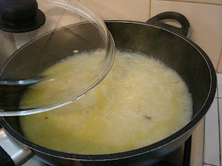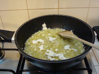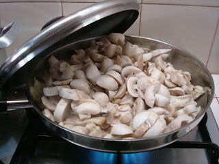 Numa fritadeira salteie, em azeite onde fritou 3 dentes de alho, os cogumelos até o molho que se forma reduzir cerca de dois terços. Num tacho derreta a manteiga e quando esta começar a ferver adicione a farinha e misture bem . Junte o caldo e mexa bem com uma colher até levantar fervura. Junte os cogumelos e envolva tudo muito bem.