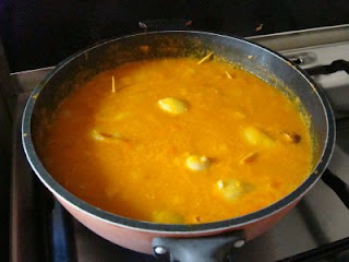 Deite esta mistura no tacho e mexa, com uma colher de pau, para envolver tudo muito bem. Deixe apurar uns minutos e apague o lume. Prove se necessitar junte sal. Eu não deitei porque, normalmente, as lulas congeladas têm sal suficiente.