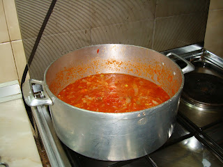 Entretanto, ponha ao lume um tacho com o fundo coberto com uma fina camada de azeite, junte a cebola, os dentes dealho, e o pimento. Deixe cozer até a cebola ficar transparente, junte o tomate e deixe cozer um pouco.