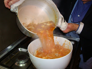 Enquanto a maruca coze, descasque os camarões e reserve as cabeças, no copo da trituradora, às quais juntou um pouco de água. Triture as cabeças e passe por um coador, se for necessário junte mais água de modo a tirar todo o suco às cabeças.