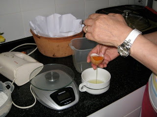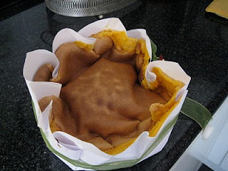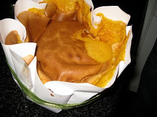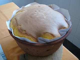 Obs2 – Ao fim de 35 min deve retirar do forno e deixá-lo arrefecer na fôrma. Parece não estar cozido mas é mesmo assim pois este pão-de-ló tem que ter uma grande parte líquida.
